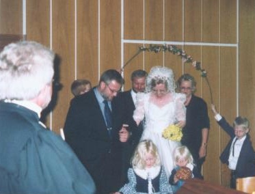 Am Arm des (falschen) Brautvaters werde ich zu meinem (richtigen) Mann an den "Altar" geführt, vorne die Streukinder Jantje und Fenja