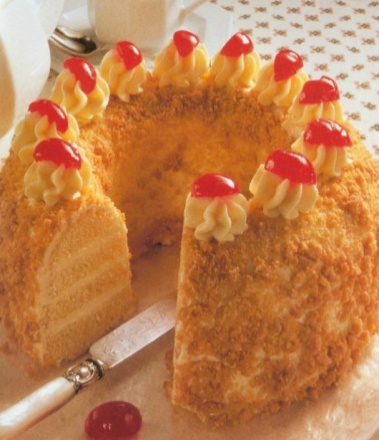 Den Kuchen herausnehmen, erkalten lassen, dann dreimal waagerecht